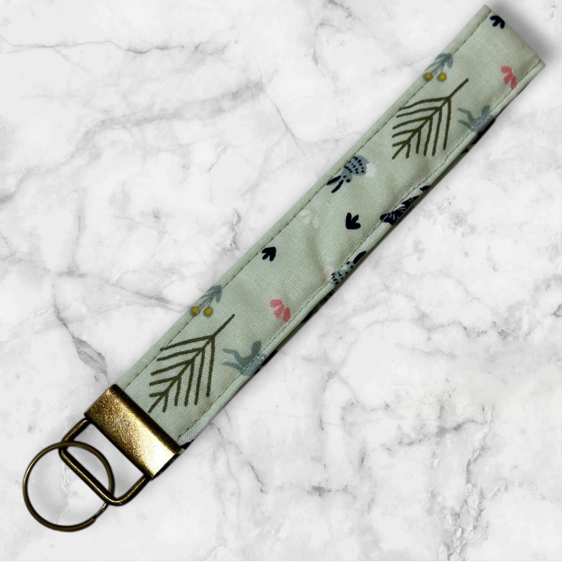 A stylish fabric wristlet designed to keep your keys secure and easy to grab, featuring a sturdy metal key ring and comfortable loop for everyday carry.